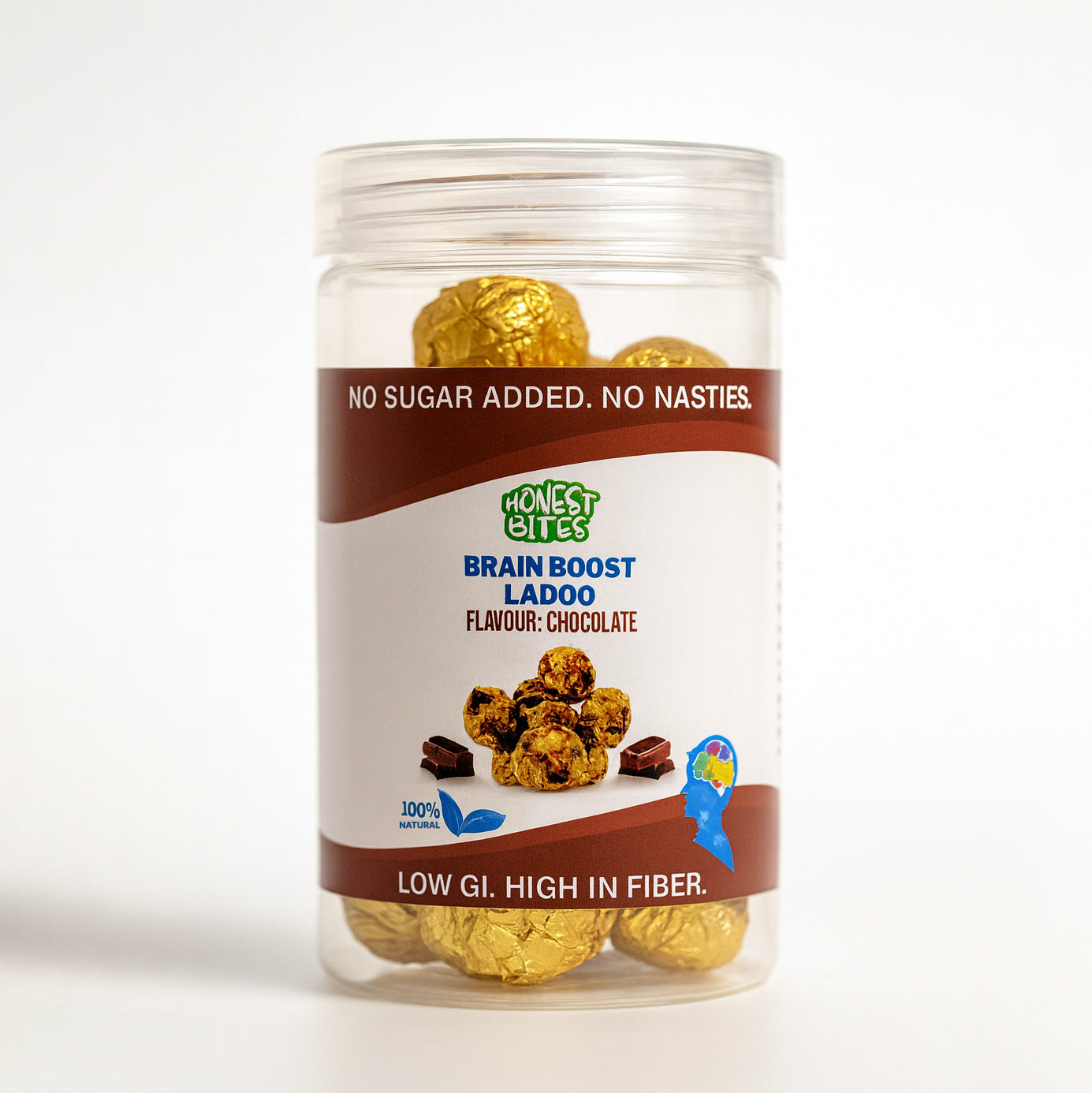 Ingredients: Walnuts • Almonds • Cashew Nuts • Pumpkin Seeds • Brahmi • Shankhpushpi • Ashwagandha • Flaxseeds • Chia Seeds • Desiccated Coconut • Sesame Seeds • Raisins • Dates • Cow Ghee • Cocoa Powder • Dark Chocolate